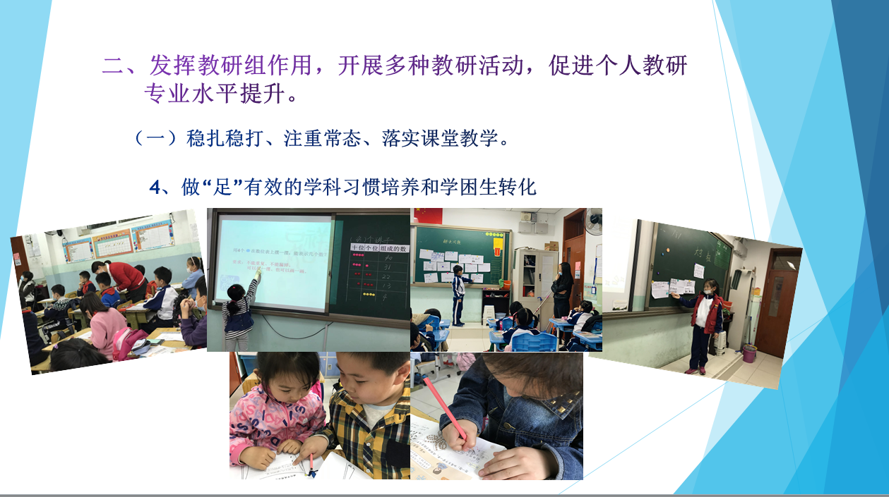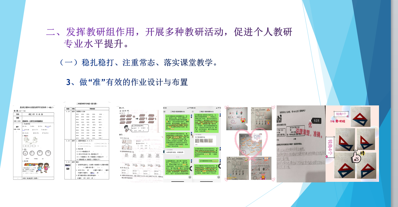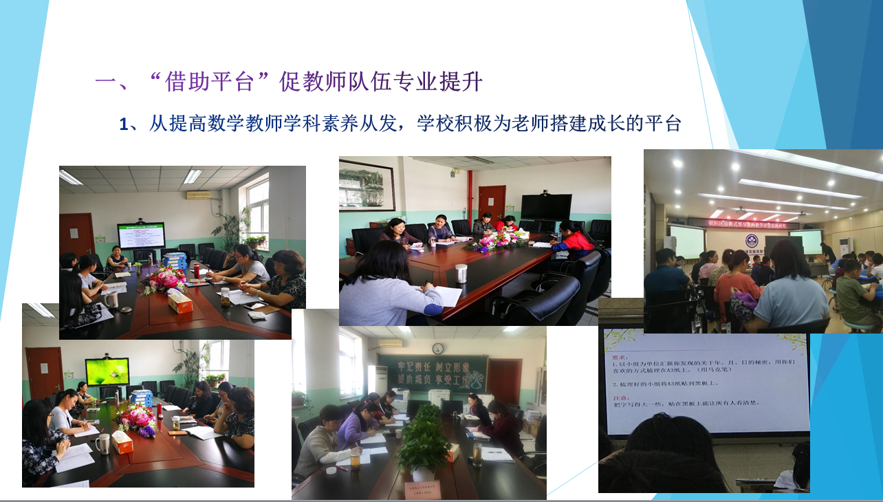 裴晶晶老师的交流以“所有的爱皆会有回报”为题,向老师介绍了自己在班主任工作中的思想、做法、效果和感受。声情并茂,事例鲜活,体现一个优秀班主任的情怀,与会老师感觉做裴老师的学生是个幸福的学生。张继东老师和阎冬梅老师关于数学学科组的建设,分别向老师们介绍了小学低部和高中的数学组建设。这两个学段可以说是中小学教育的起点和终点,备受家长关注、社会关注。起点,大家关心起跑怎样;终点,大家关心结果怎么样。汇报体现了数学组的学科建设的特色,展现了数学组以学生为本的思想,体现了立德树人的基本理念。他们在数学教学中成为学生学习数学知识的引路人、具备数学思想和数学思维的引路人,成为学生热爱工作、奉献与关爱他人的引路人。王静、张涛老师汇报了我校参与的朝阳区督导室的重点课题“诊断式督导教育教学” 的实践情况,两位老师向全校教师介绍了课题的理念、课题的实践方式方法、课题的进程、成果和体会,展现了高中化学组和初中英语组的课题实践的踏实努力与效果。